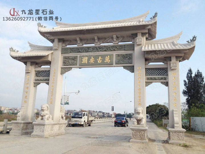 <span background-color:#ffffff;font-size:16px;"="">大型石雕牌坊的制作工藝精湛,石雕牌坊公司雕刻圖案精美,可以深刻的反映出人們的精神面貌。比如,描繪美好藍(lán)圖、展示自我風(fēng)采、祈求平安富貴等等,這些都可以在村門石牌坊雕刻中展現(xiàn)出來。建在村莊入口處的村門石牌坊,展現(xiàn)的是一種內(nèi)心強(qiáng)有力的自豪感,是謳歌時代,對國家未來的發(fā)展,充滿信心的美好憧憬。村門魚臺石牌坊就如同宗祠-樣,具有凝聚人心的重要作用,而且激發(fā)著村民積極向上。