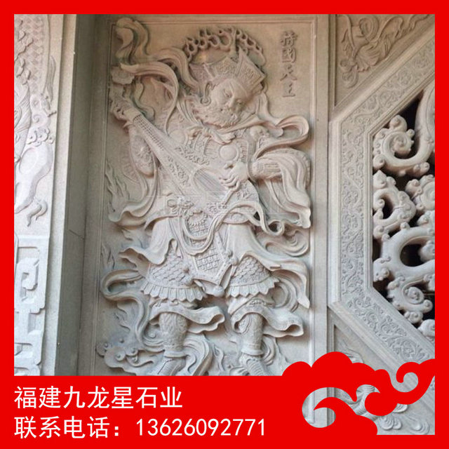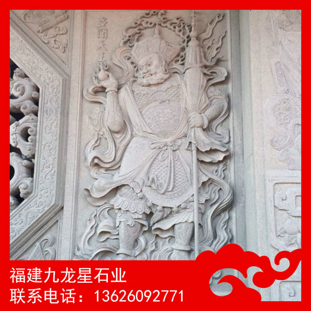 四大天王浮雕 寺廟佛像浮雕——又稱護(hù)世四天王,是佛教的護(hù)法天神,俗稱“四大金剛”。四大天王為二十諸天中的四位天神,位于第一重天,第一重天又叫四天王天。根據(jù)佛教經(jīng)典,須彌山腹有一山,名犍陀羅山,山有四山頭,各住一山各護(hù)一天下(四大部洲,即東勝神洲、南贍部洲、西牛賀洲、北俱蘆洲),故又稱護(hù)世四天王 ,是六欲天之第一。他們的神像通常分列在凈土宗禪宗佛寺的第一重殿兩側(cè),因此又稱天王殿。