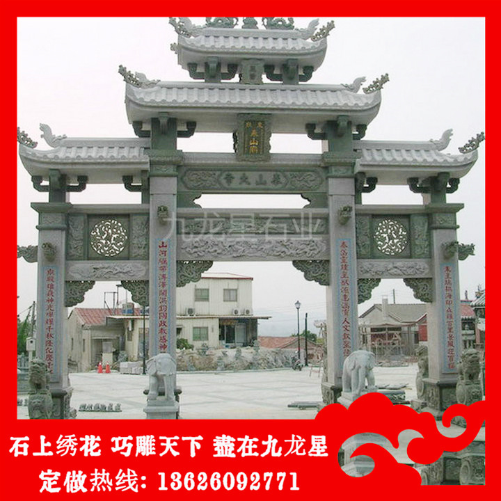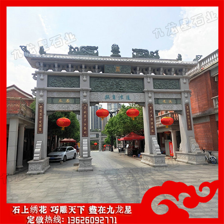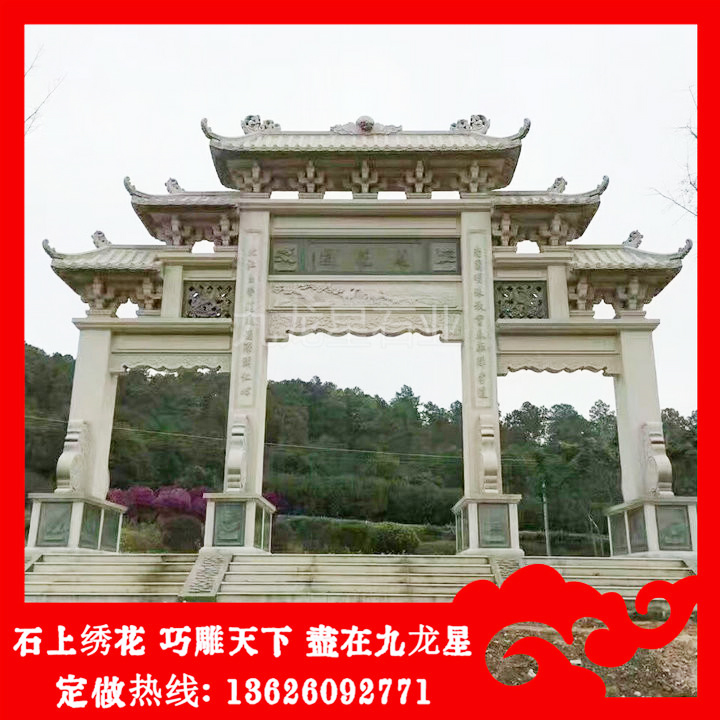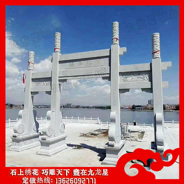 石牌坊(三層石雕牌坊圖片大全 青石石牌坊廠家)——九龍星石業(yè),二十年專業(yè)的石雕牌坊廠家。 三層石雕牌坊圖片大全就是指用石材石料雕刻制做而成的石牌坊,這種青石石牌坊儲存時間長,不容易,易儲存。但是缺點也非常明顯,加工難度大,安裝難度大,價格也比較昂貴。三層石雕牌坊圖片大全的間距也被稱之為門,一般單門的石雕牌坊是不太建議的,多門所造成的視覺感受給人一種極具美感的,明顯有別于其他的建筑節(jié)奏,幾根立桿和條狀組合,形成多面空門的形態(tài),橫豎交叉的結構是石雕牌坊最基礎的結構。
