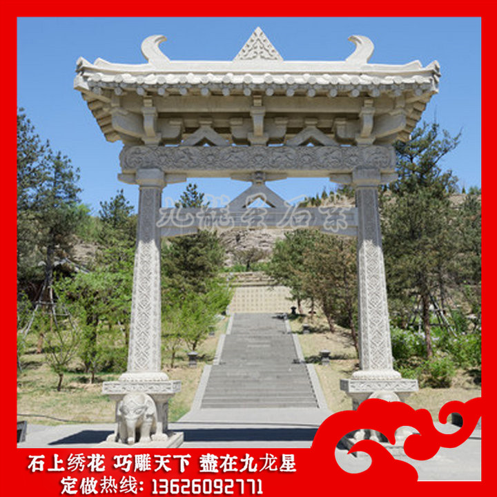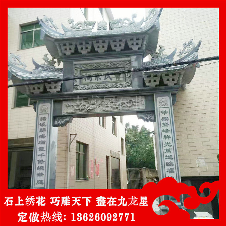 石牌坊(單門石牌坊價格 村莊石牌坊廠家)——九龍星石業(yè),款式多樣。 單門石牌坊常見于一些鄉(xiāng)村小路上,別看這種村莊石牌坊只有一個門,其樣式也是非常美觀大氣好看的,更不會因為只有一個門而顯得多么單調(diào)。不管是村口或者祠堂、宗祠、景區(qū)、公園等地方都可以看到單門石牌坊的存在,這也說明了單門石牌坊在現(xiàn)代社會中非常盛行,以村莊石牌坊廠家的經(jīng)驗來解說其數(shù)量多的原因,一是單門石牌坊價格比較便宜,二是村莊修建單門石牌坊是因為其道路寬度合適,而要是修建三門石雕牌坊那么就需要一些道路較寬的村莊了。