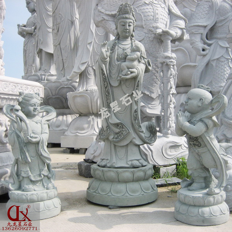 一般來說送子觀音石雕像的形態(tài)便是觀音菩薩在祥云之上,手抱一個小孩,后邊跟著一對金童玉女的形象存在,并且這種石雕廣泛應(yīng)用于寺廟,有的人家里也會擺放一尊,便利家里人能用忠誠的心感動菩薩,然后達到得“子”這個愿望。