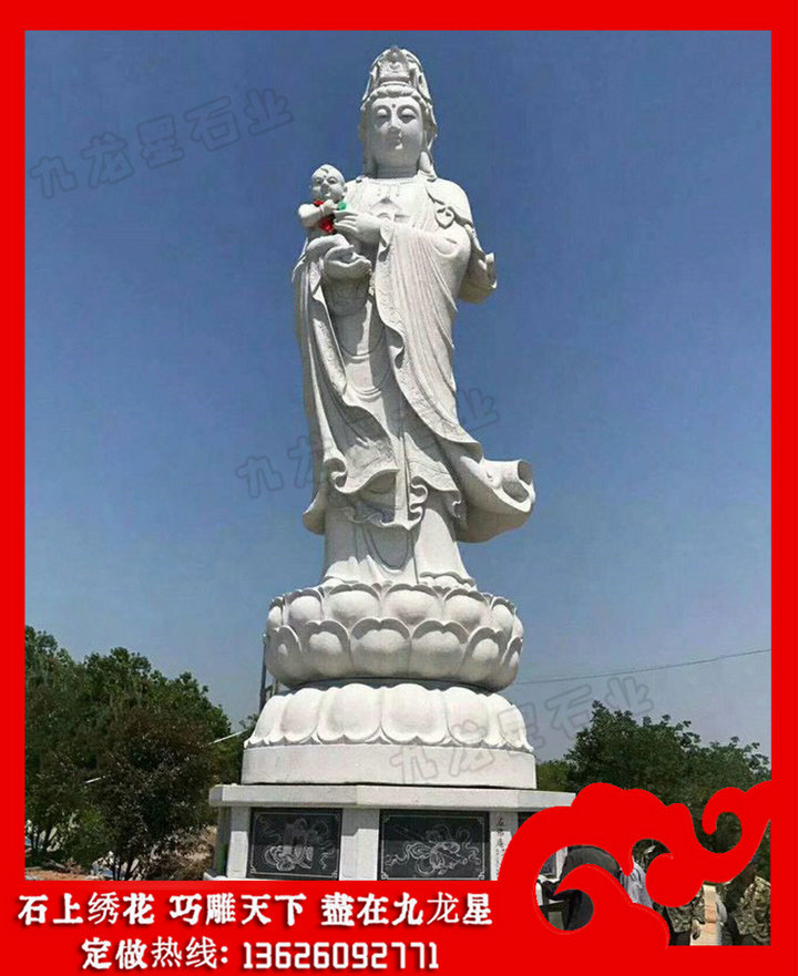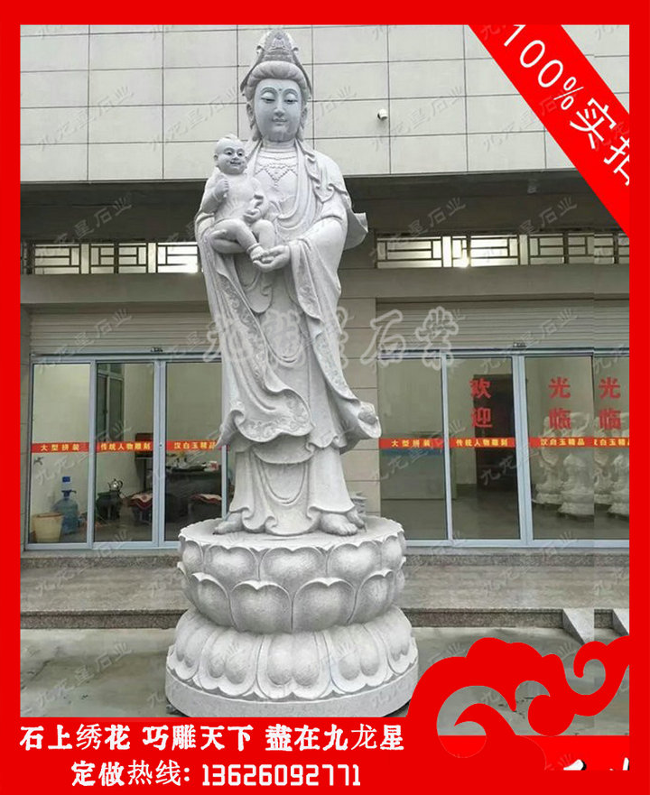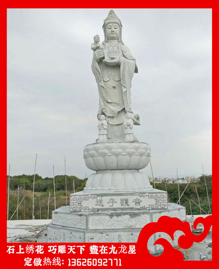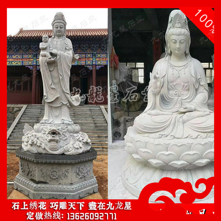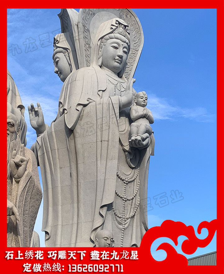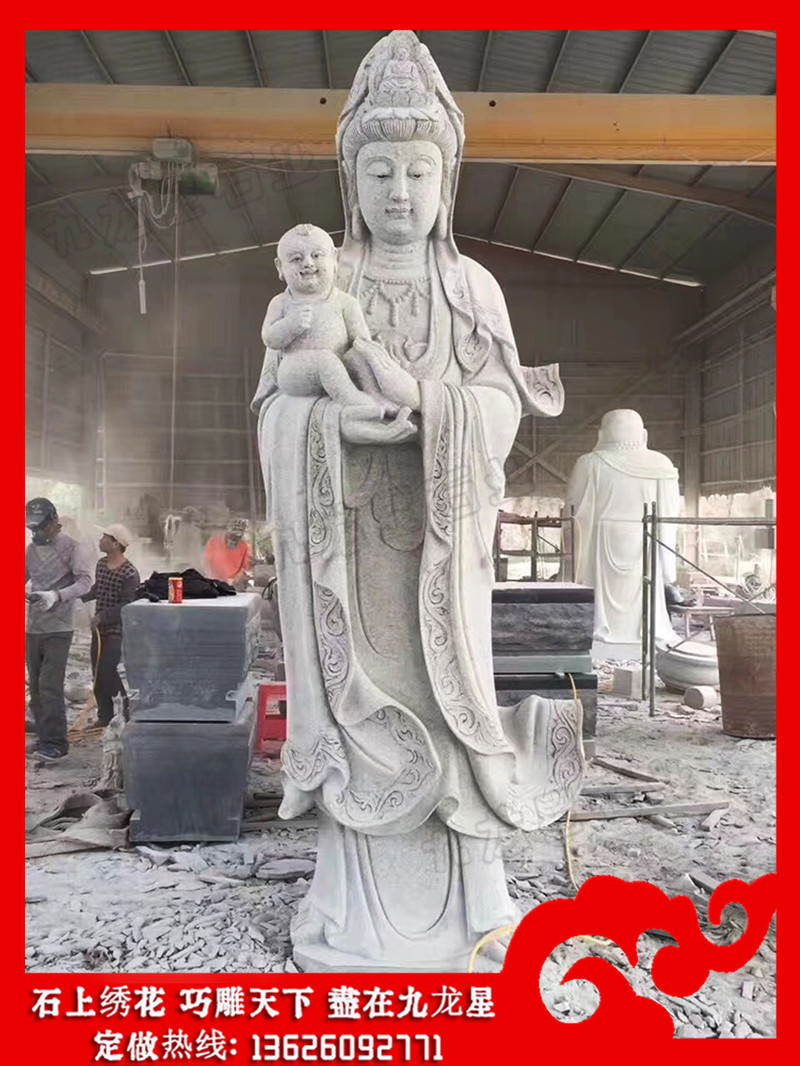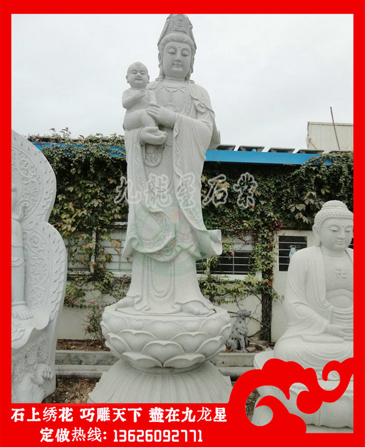 送子觀音石雕像的圖片造型有很多,我們常見(jiàn)的有以下幾種:雙手抱著一個(gè)小孩的,這種送子觀音石雕像針對(duì)的是膝下無(wú)子女的這類(lèi)人,一般這個(gè)小孩看不出是男是女。還有一種就是可以看出來(lái)是男的,這種就是滿(mǎn)足膝下無(wú)子的一種形態(tài)。雙手各抱一個(gè)的送子觀音石雕像,這樣的是一種對(duì)多子多福的一種期盼。這樣的形態(tài)就是希望生雙胞胎或者更多的子女的,其實(shí)更多子女最好的表現(xiàn)手法是后面還跟著金童玉女,這樣就更好了。