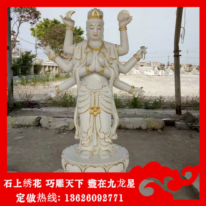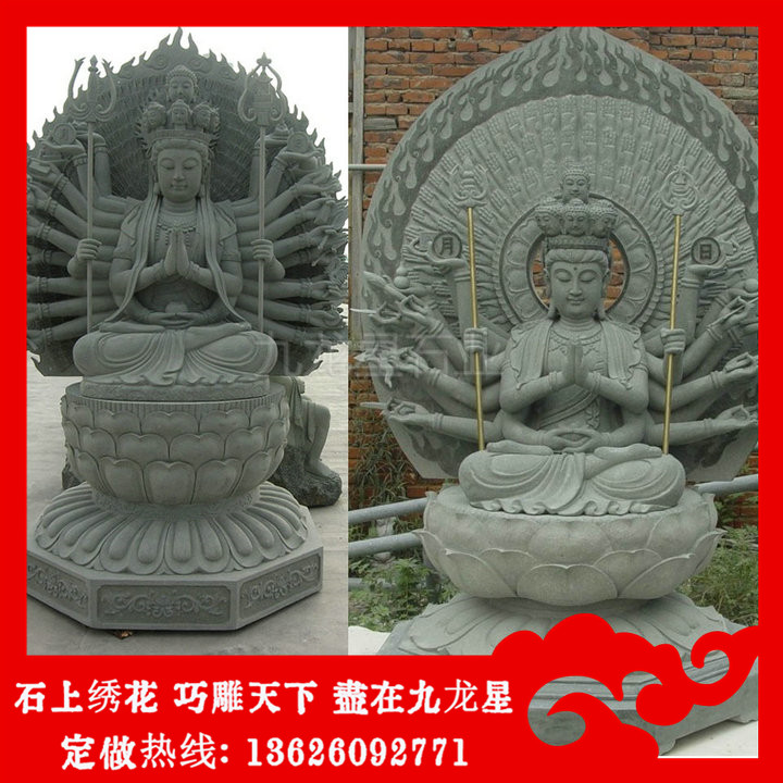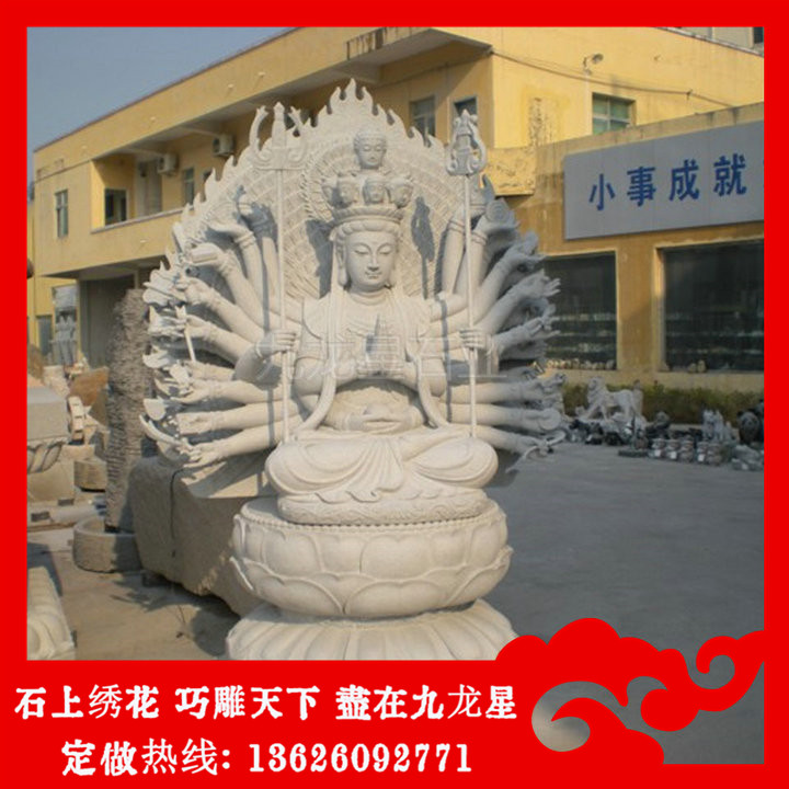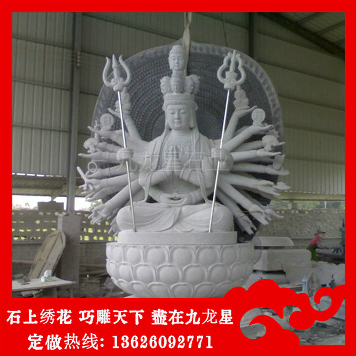 石雕觀音(石雕千手千眼觀音菩薩 石雕千手觀音廠家批發(fā))——九龍星石業(yè)。 石雕千手千眼觀音菩薩的全稱是“千手千眼觀音”或“千眼千臂觀音”,是密宗的六觀音之一。石雕千手觀音的"千只手"如扇面形排列幾層,有如孔雀開屏一般,十分壯觀。過去在北京人的一些家里,多供奉著一張《千手觀音》像,只見那觀音立于蓮花寶座之上,頭梳發(fā)結,身披袈裟,戴佛冠,赤雙足。面帶慈祥,端莊而靜雅。千手表示遍護眾生,千眼則表示便觀世間。