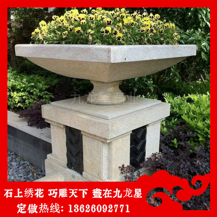 石雕花缽(黃銹石花缽石雕 黃金麻石材花缽圖片大全)——九龍星石業(yè)。