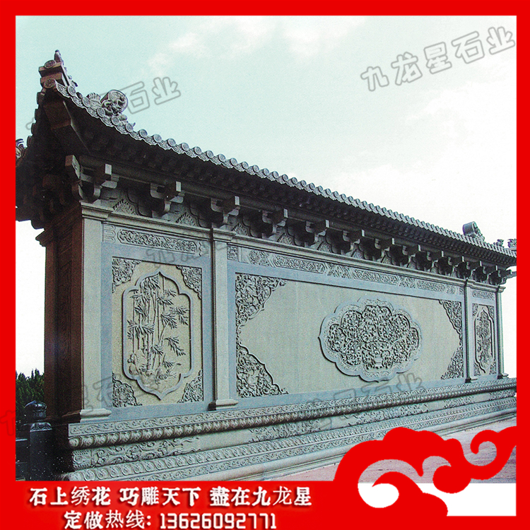 影壁墻也稱照壁,壁身都為正方形,四周用石雕磚雕裝飾,中間的方塊為書法或者繪畫。中式石雕照壁圖案設(shè)在大門之內(nèi)的迎門處,有的是單獨建筑的,有的是鑲在廂房山墻上的。有些家庭,為了裝飾點綴院落,也會在院落一進(jìn)門處的正對面,修建一個影壁,也即是一堵磚墻。祠堂照壁在正對大門的這一面,一般都有花卉、松竹圖案或者大幅的書法字樣醒目地放置影壁正面。祠堂照壁上書“?!?、“祿”、“壽”等象征吉祥的字樣。