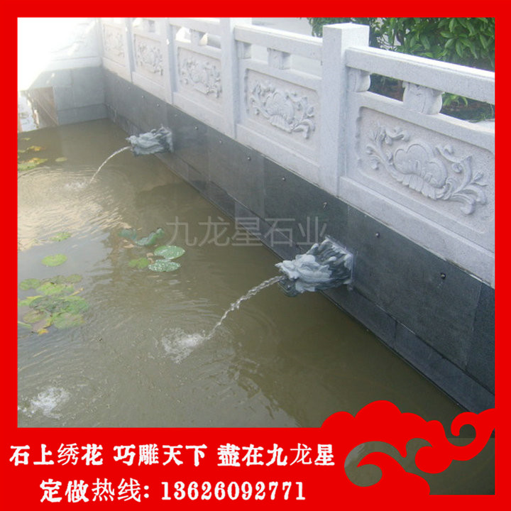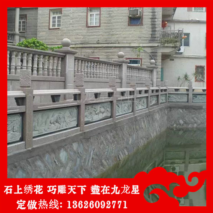 石雕欄桿(河道石欄桿多少錢 石材欄桿廠家批發(fā))——九龍星石業(yè),二十年石雕廠家。 河道石欄桿的使用比較廣泛,一般河道兩旁地面的高低不同,在安裝石材欄桿之前必須先填好臺基,讓地面保持平坦,在安裝河道石欄桿的時候要注意穩(wěn)定性和加固作用,確保每一塊石欄桿材料都拼接完整牢固。河道石欄桿多少錢也是人們關(guān)心的問題,通常石材欄桿廠家批發(fā)選用的石料有漢白玉、青石、花崗巖、大理石等石材,一般河道兩旁應(yīng)用的石欄桿面積比較廣,漢白玉石料價格昂貴,所一般不推薦,選擇相對價格實惠的用作河道兩旁的護欄比較多,花崗巖堅固耐用就很不錯。