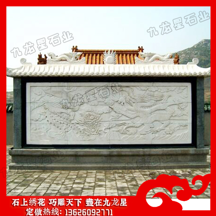 青石照壁雕刻圖片的形式多做成與普通房屋子屋頂一樣,有四面坡的廡殿頂和歇山、懸山、硬山四種形式,按照壁的大小和重要程度而分別采用。各種形式的石雕照壁頂雖然面積不大,但依然上面鋪筒瓦,中央有屋脊,正脊兩端有正吻,垂脊兩端有小獸,四角一樣有起翹,具有屋頂一樣的各種部件與裝飾。當然也有個別照壁是沒有壁頂?shù)模缱辖蔷叭蕦m的一座石照避,完全是一座頂上光光的石造屏風放在下面石座上。石雕照壁哪家好,來惠安九龍星石業(yè),二十年雕刻工藝。