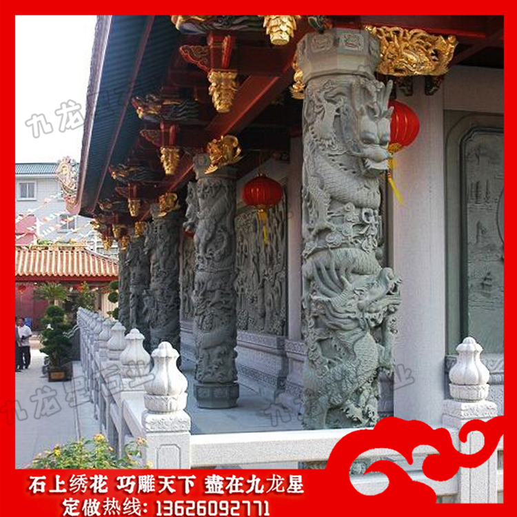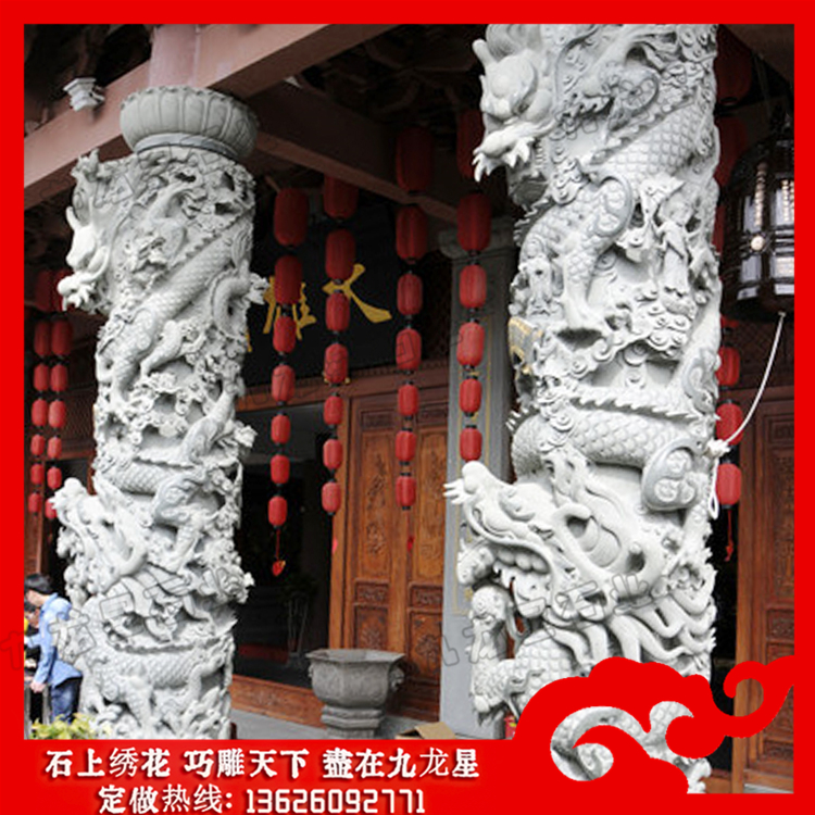 寺廟石龍柱雕刻常見的是被使用在家祠大殿前面走廊頂梁柱使用,一般是六根或者八根組成,這樣的石龍柱被稱之為大殿石龍柱。 大殿石龍柱常見的規(guī)格是直徑65厘米,高度制作到5.5米,由于大殿的走廊都非常的高,所以這個高度也是必要的,雕刻工藝基本上都是由一條龍盤旋而上的雕刻手法,其深度是龍柱直徑的十分之一左右。