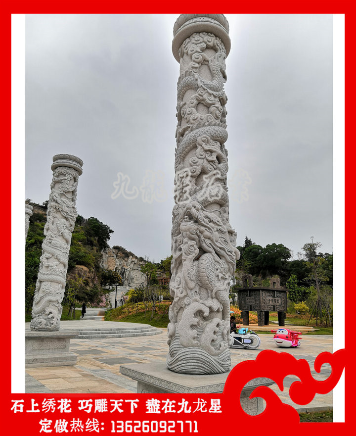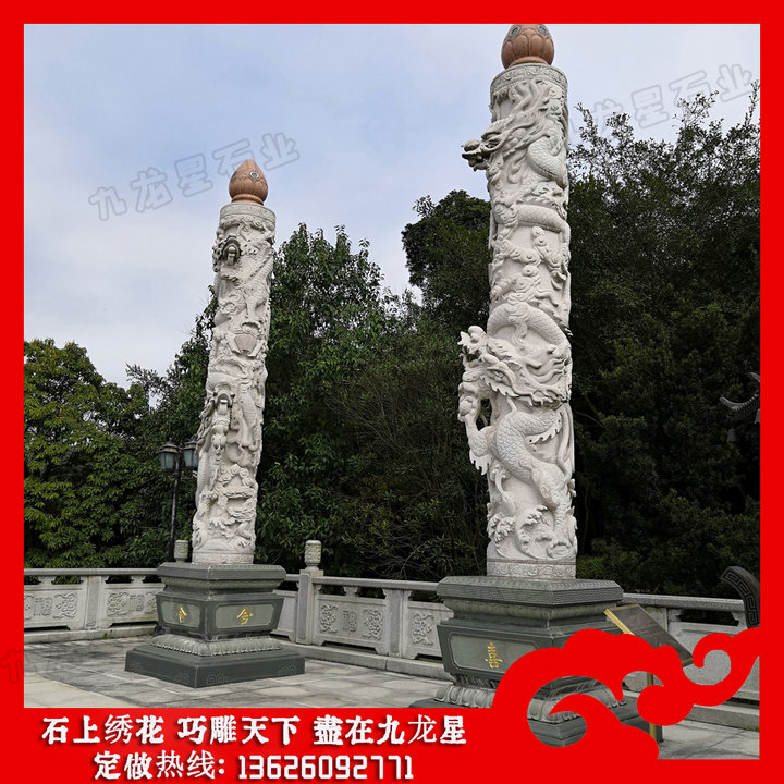 石雕龍柱(花崗石華表龍柱 福建青石雙龍浮雕柱)——九龍星石業(yè)。 花崗石華表龍柱和石雕龍柱相似之處,也是由柱礎(chǔ)石,柱身組成,但和石雕龍柱不同,所有的花崗石華表龍柱都有承露盤(pán)和獨(dú)角獸,并且,在承露盤(pán)線面左右各有一個(gè)翅膀一樣的東西。花崗石華表龍柱有的只是雕刻祥云而已,但是在下面的柱體部分有很多元素可以選擇,比如花鳥(niǎo)蟲(chóng)魚(yú)等等,線條,文字,圖案,浮雕,影雕,線條,沉雕等等,甚至圓雕都可以很好的融入到華表柱中。