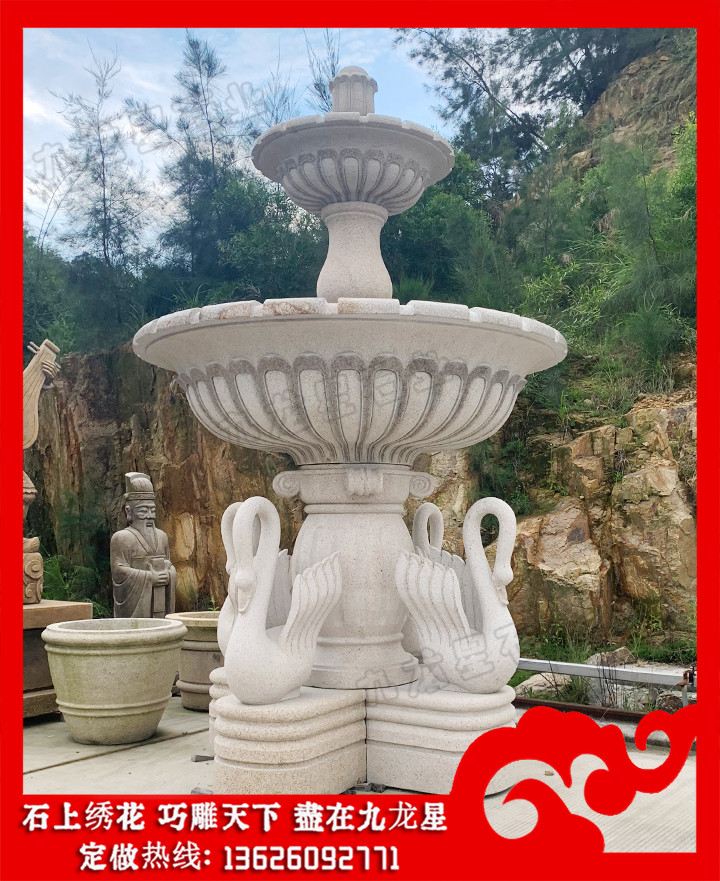 石雕噴泉(噴泉石雕造型 做一個石雕噴泉多少錢)——九龍星石業(yè)。 石雕噴泉是石頭與噴泉水相結(jié)合,在噴泉內(nèi)部放置抽水泵將水從底部抽出來再通過人工設置的噴泉口或者是出口,將水向上噴出,從而形成花狀的水柱,使水賦予靈魂,因此被叫做石雕噴泉。噴泉石雕造型多種多樣,有中式、西式、歐式等等風格,不同的噴泉石雕造型,它的價格也會不一樣。所以說客戶在問的做一個石雕噴泉多少錢,是需要根據(jù)客戶的需求預算來進行計算的。