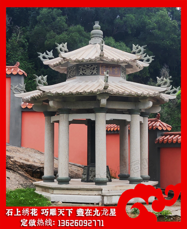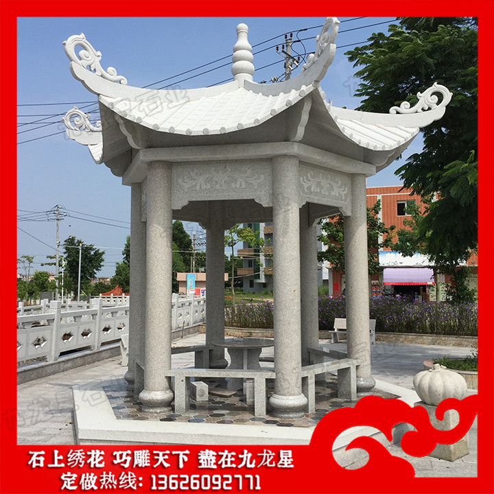 石雕涼亭(花崗巖石亭子圖片樣式大全 古建石亭子設(shè)計)——九龍星石業(yè)。 古建石亭子可以作為那個時代特有的建筑象征,花崗巖石亭子圖片樣式大全也是造型各異,各具特色,是中國古代一種十分特別的建筑形式。在漢字的發(fā)音中,亭與“停”讀音一致,同時讓人看著這個“?!弊郑幻饬钊税l(fā)生聯(lián)想,仿佛說的是一個人站在亭子邊上似的相像。翻看古典字典,原來在漢字的造字中,人們一直在行走,總要有駐足留步休憩的地方,而古代這種亭子的建筑形式,也就是專門為行人駐足小憩而特地量身打造的一個小站點。