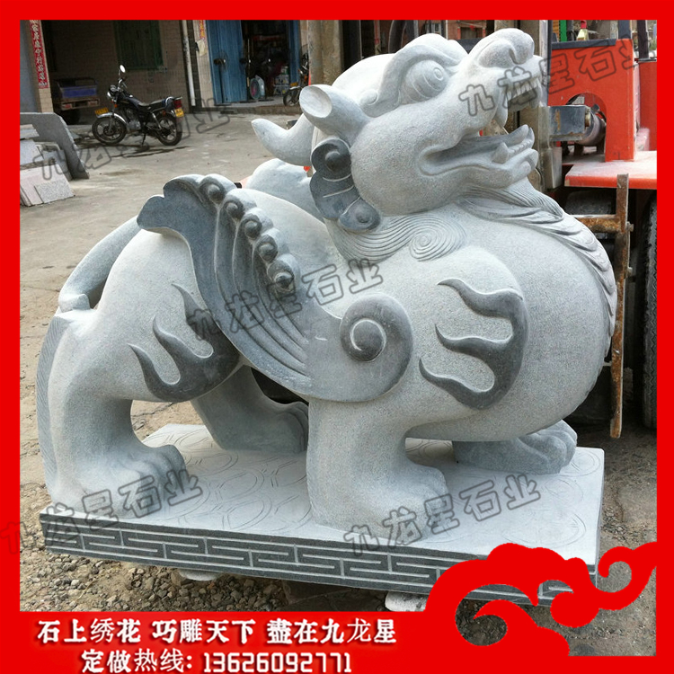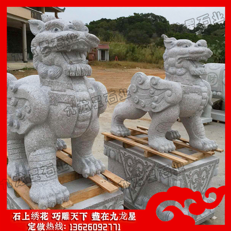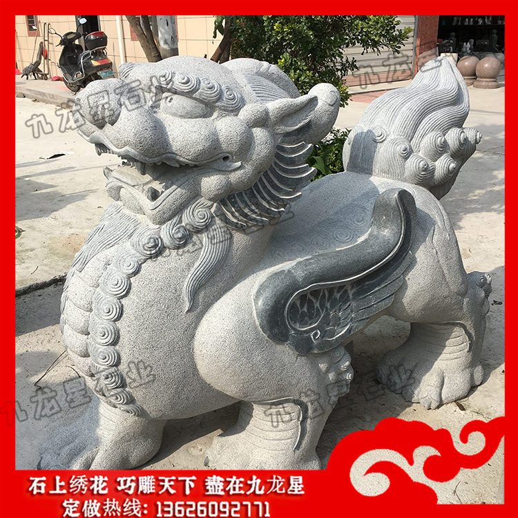 花崗巖貔貅雕刻的造型很多,難以細(xì)分。經(jīng)過(guò)朝代的轉(zhuǎn)變,貔貅的形態(tài)比較統(tǒng)一,龍頭、馬身、麟腳,額下有長(zhǎng)須,兩肋有翅膀,會(huì)飛,且兇猛威武,如有短翼、雙角、卷尾、鬃須常與前胸或背脊連在一起,突眼,長(zhǎng)僚牙。到現(xiàn)在常見(jiàn)到、較為流行的形狀是頭上有一角,全身有長(zhǎng)鬃卷起,有些是有雙翼的,尾毛卷鬚。