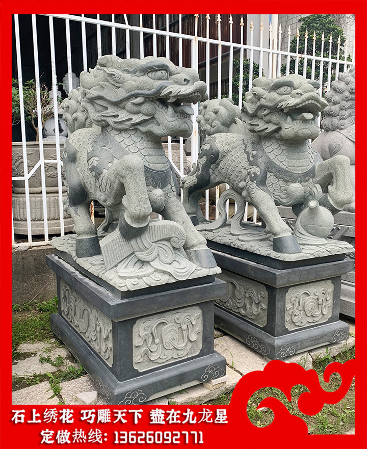大門口石雕麒麟,中國傳統(tǒng)祥獸,神話傳說是龍牛雜交品,是中國古籍中記載的一種神物,與鳳、龜、龍共稱為“四靈”,是神的坐騎,古人把麒麟當(dāng)作仁寵,雄性稱麒,雌性稱麟。麒麟與貔貅的區(qū)別:石雕麒麟是吉祥神寵,主太平、長壽。民間有麒麟送子之說,麒麟是龍頭,麝鹿身,尾似龍尾狀,龍鱗。它的綜合面不及龍、鳳那么廣泛,不過名氣也不算小。