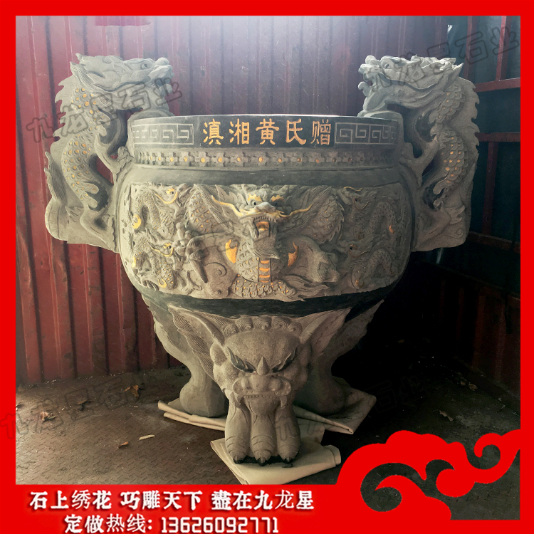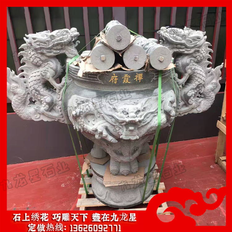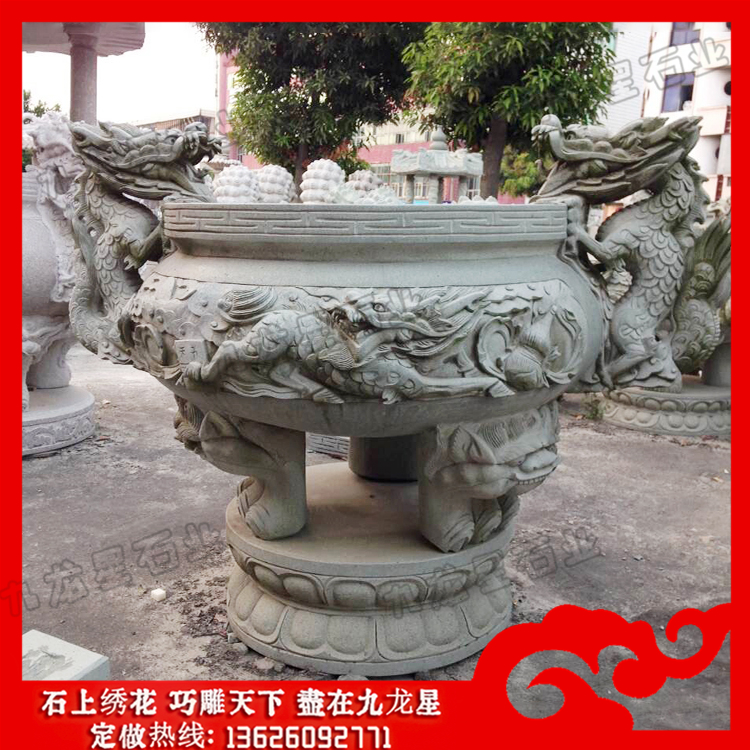 石雕香爐大多采用優(yōu)質(zhì)的青石,精雕細琢而成。它的兩邊雕刻的龍形象栩栩如生。寺廟的雙龍石雕香爐在日常生活中起到的最大作用,就是用于盛載香支,以作寺廟日常供奉神明之用。