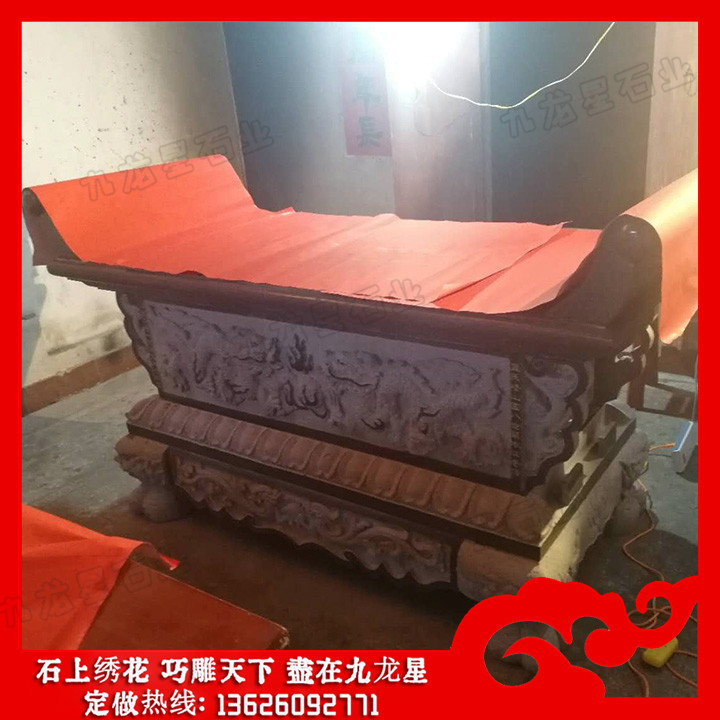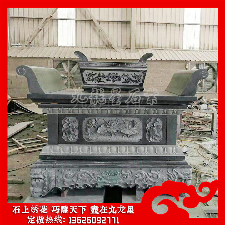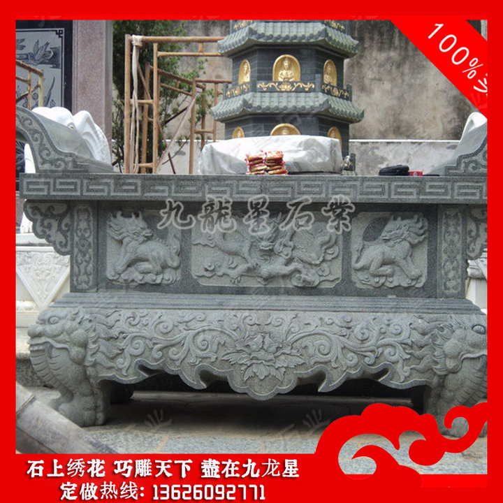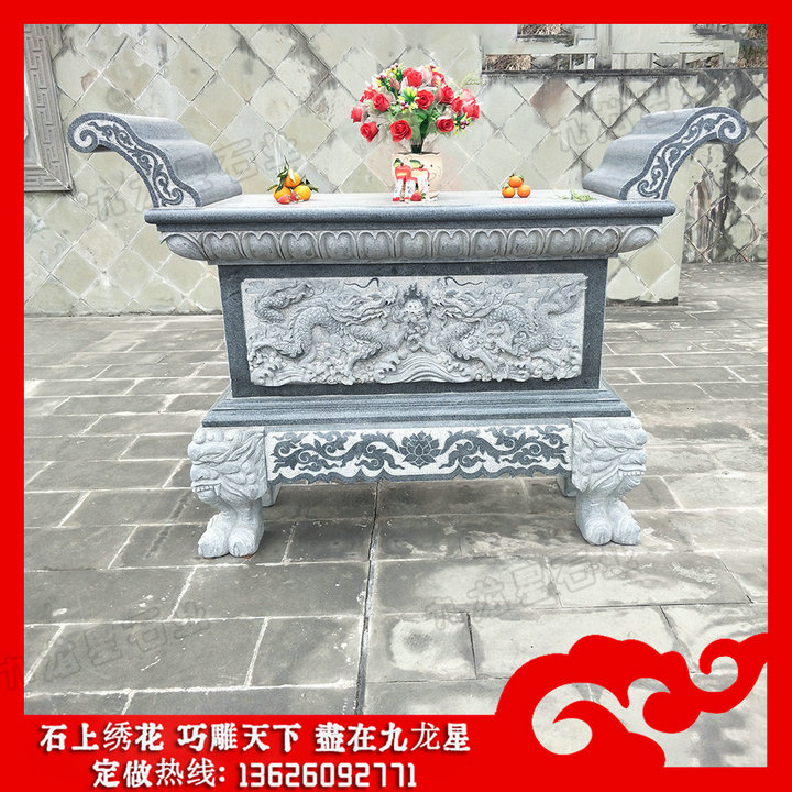 石材供桌(石雕供桌設(shè)計 寺廟石雕供桌價格如何)——九龍星石業(yè),可根據(jù)需求定做批發(fā)。 石雕供桌是寺廟用來擺放貢品的桌子,一般都會選用石材桌子,簡稱石雕神臺、石材供桌。寺廟石雕供桌雖然是用來放置香燭貢品牲禮之用,但石雕供桌設(shè)計有分體式也有整體式,其設(shè)計構(gòu)造大致可分為桌面、桌腳以及裙面。在寺廟宗教文化里,石材供桌的大小,材質(zhì),以及擺放的位置都是有講究的,及雕刻所選用的石材。其中,花崗巖和青石質(zhì)地堅硬,是石雕供桌常用的兩種雕刻石材。