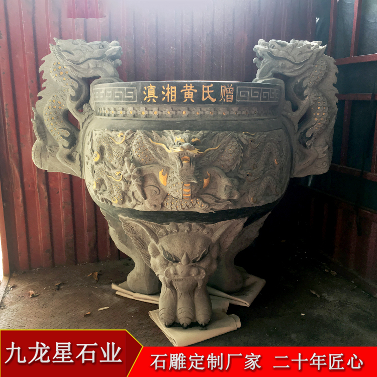 寺廟石雕帶蓋香爐 大型圓形平口香爐石雕——九龍星石業(yè)