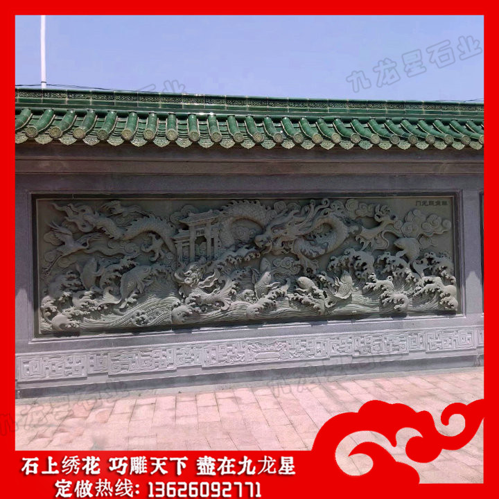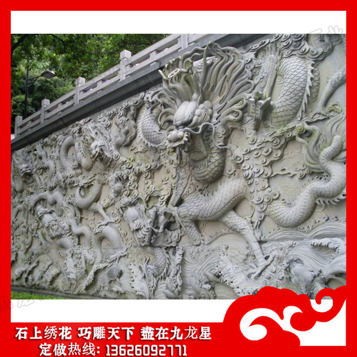石雕照壁(石材浮雕照壁 九龍照壁雕刻廠家)——九龍星石業(yè),廠家直銷。 從古至今,皇家使用的石材浮雕照壁是較為豪華、壯麗。故宮內(nèi)乾隆做太上皇時住過的寧壽宮,門前有一座大照壁,由彩色琉璃磚瓦砌就,壁上用琉璃磚鑲嵌成九條蟠龍,嬉戲于波濤云海之中,動感十足,仿佛呼之欲出,既華貴又威嚴(yán),這就是中外聞名的故宮九龍壁。故宮內(nèi)的東、西六宮,每個院落宮殿門前幾乎都有一座影壁石材浮雕照壁,有木制的,有石雕九龍壁 九龍照壁雕刻,有琉璃的九龍壁,上面雕刻吉祥圖案,十分精美。