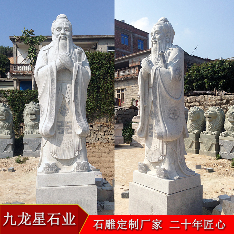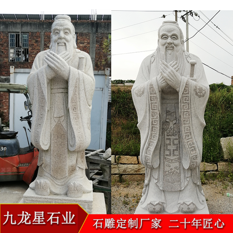 一般比較常見的白麻孔子像石雕塑有比較簡單的頭像,也有站姿的石雕像,基本上站立姿勢的石雕像選擇性更受到人們喜愛,有手里握著書卷拿在胸前,一手背在身后,抬頭挺胸,眼神眺望的石雕孔子像,也有將雙手交叉并在胸前,但是我們可以看到交疊的手是不露出大拇指的,象征著謙恭有禮,而四指并攏,也代表著四海之內(nèi)皆兄弟,有著友愛、友誼的象征意義。