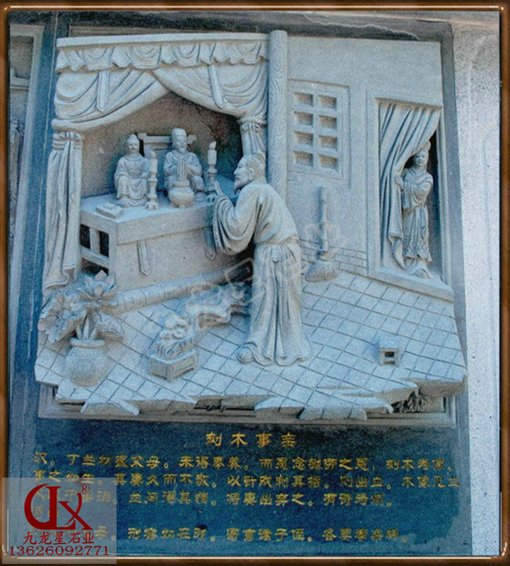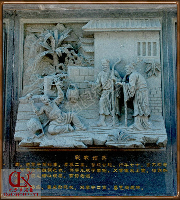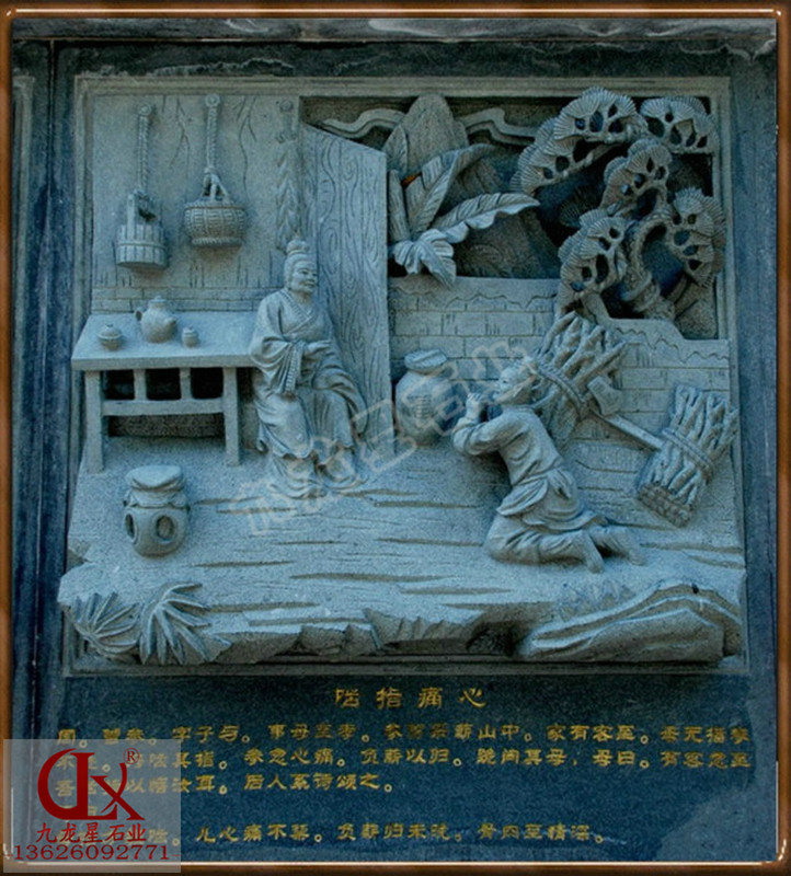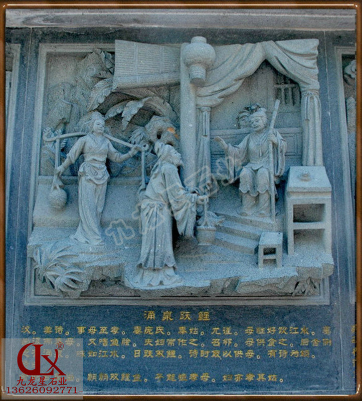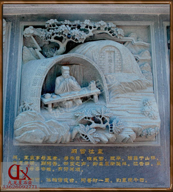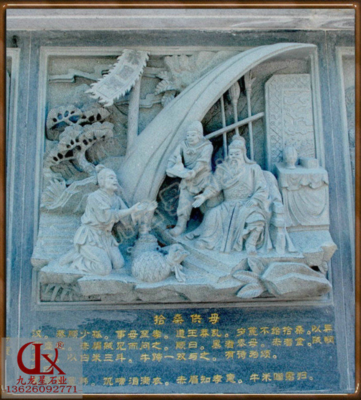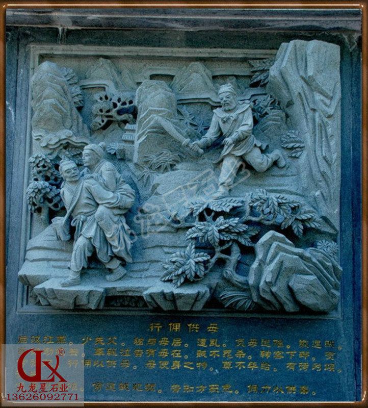 浮雕24孝(二十四孝浮雕壁畫 青石浮雕二十四孝)——九龍星石業(yè),廠家直銷。 二十四孝浮雕壁畫是中國古代重要的倫理思想之一,元代郭居敬輯錄古代24個孝子的故事,編成《二十四孝》,序而詩之,用訓(xùn)童蒙,成為宣傳孝道的通俗讀物。以后,又有人刊行《二十四孝圖詩》、《女二十四孝圖》等,流傳甚廣。在傳統(tǒng)的木雕、磚雕和刺繡上,常見這類題制的二十四孝浮雕壁畫通常是采用青石雕刻而成。 青石浮雕二十四孝是石材浮雕雕刻的一種石材之一,二十四孝浮雕壁畫既有“成教化,助人倫”的實用價值又有“藝術(shù)形式之完美、表現(xiàn)技法之純熟、雕工之精妙、外觀之華麗”的審美價值。